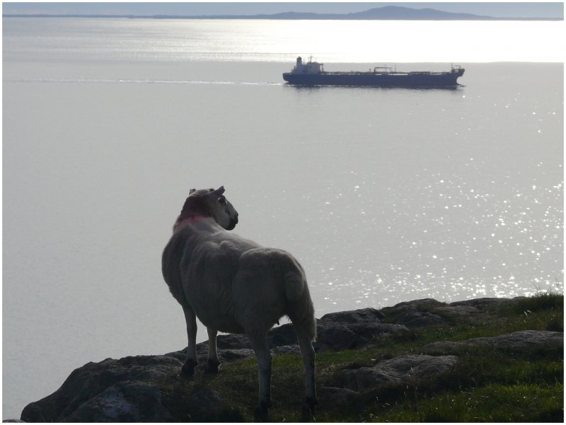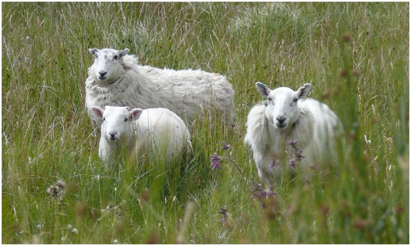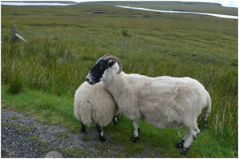 Schafe auf der Strasse zum Old man of Storr, dem Felsen im Hintergrund. (07.08.2008)